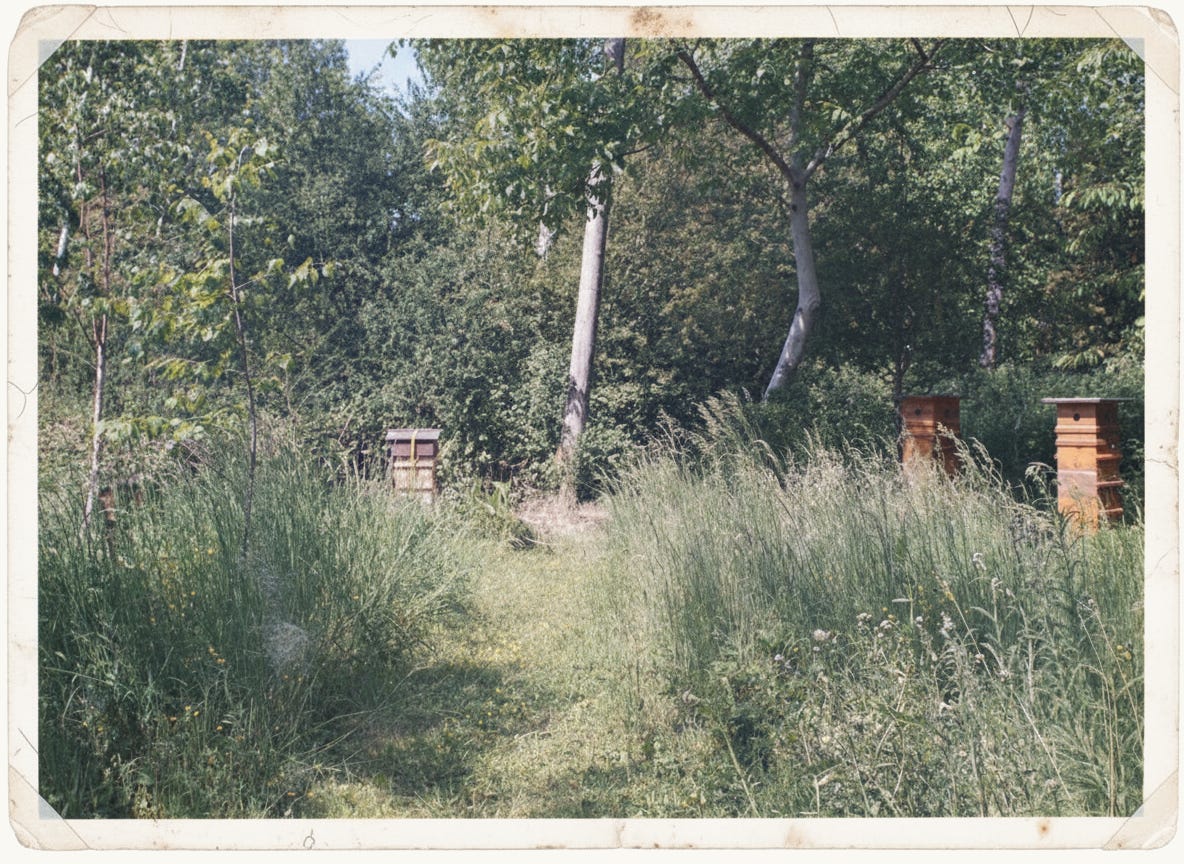 At the edge of the woodlot, half in the hawthorns’ shade and half leaning toward the open field, stand my hives. Between gardening chores, I sit there, watching.