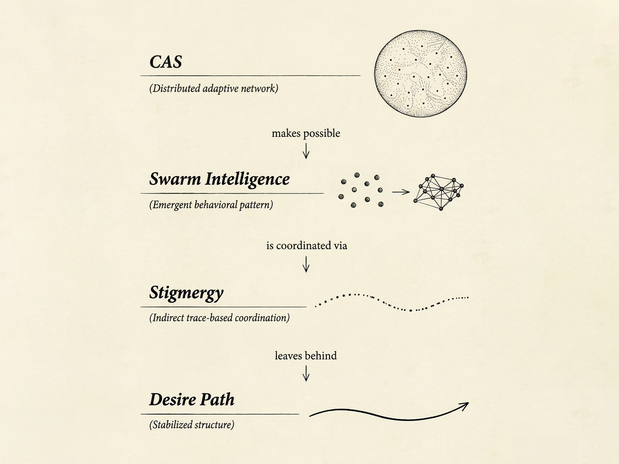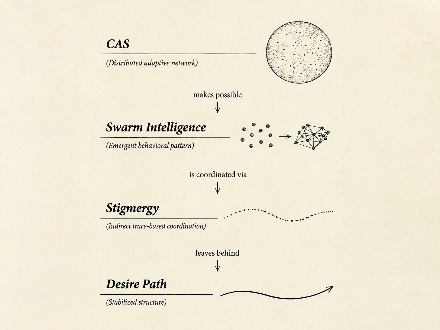 CAS → Swarm Intelligence → Stigmergy → The Desire Path
